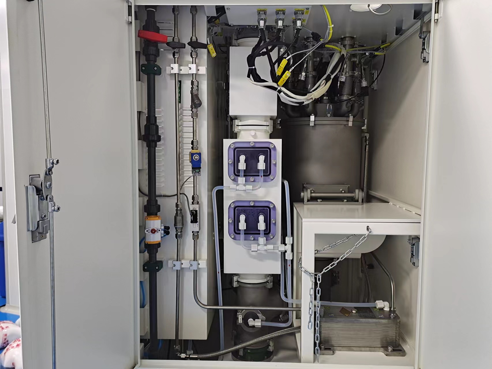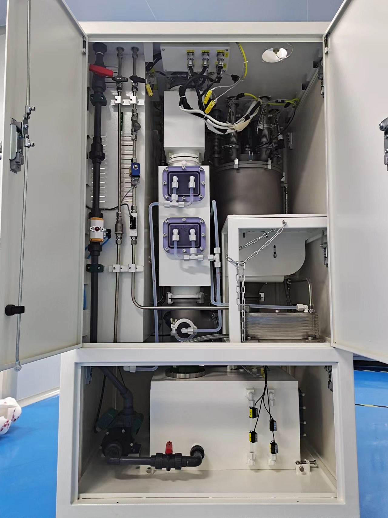 | 3 | 漏液侦测器 | 设备水箱前端、顶端 | 断开自来水、冷却 水、循环水和排水 | 红灯 | 报警 | 是 | 人工复位 | 硬件 | 安全继电器 |
