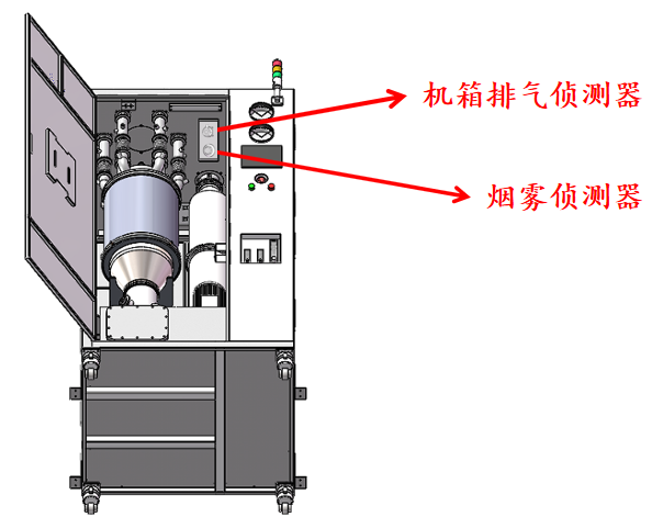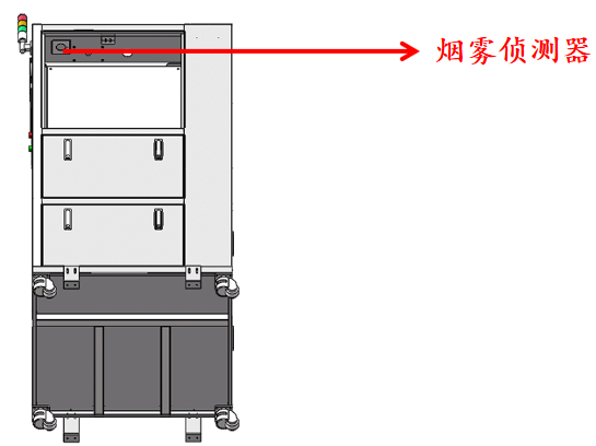 | 2 | 烟雾侦测器 | 电控箱上端、 机箱内上端 | 断开主电源 | 红灯 | 报警 | 是 | 人工复位 | 硬件 | 安全继电器 |