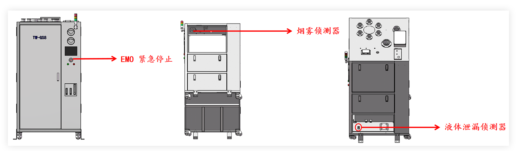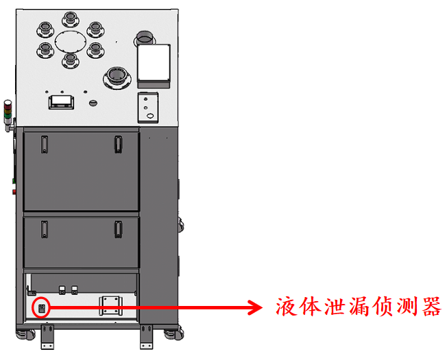 | 3 | 漏液侦测器 | 设备水箱前端、顶端 | 断开自来水、冷却 水、循环水和排水 | 红灯 | 报警 | 是 | 人工复位 | 硬件 | 安全继电器 |