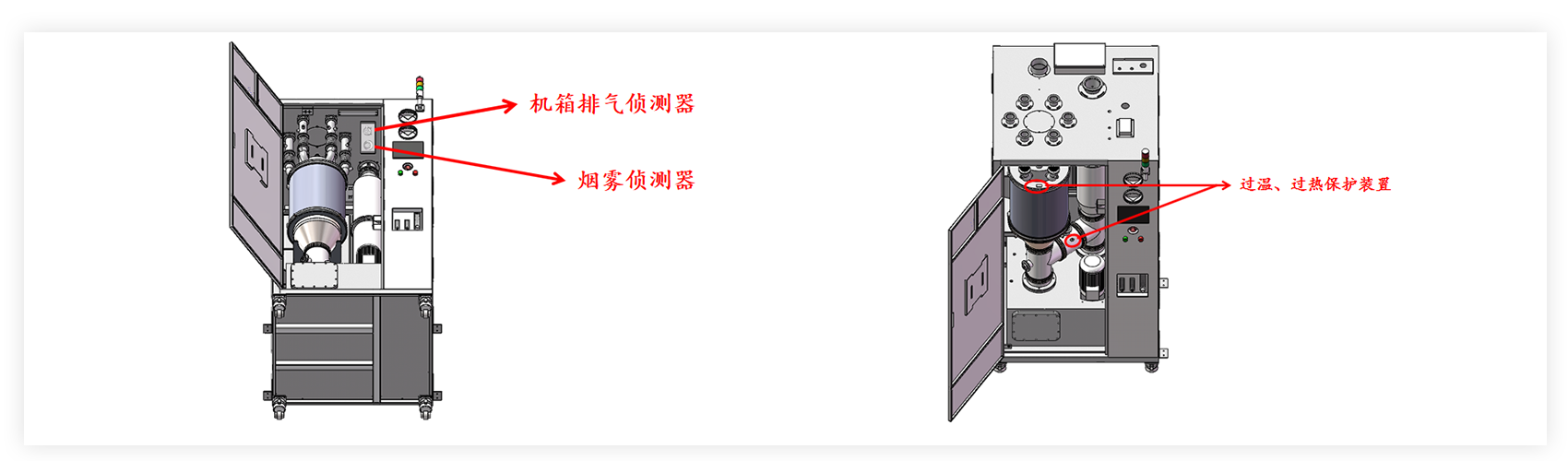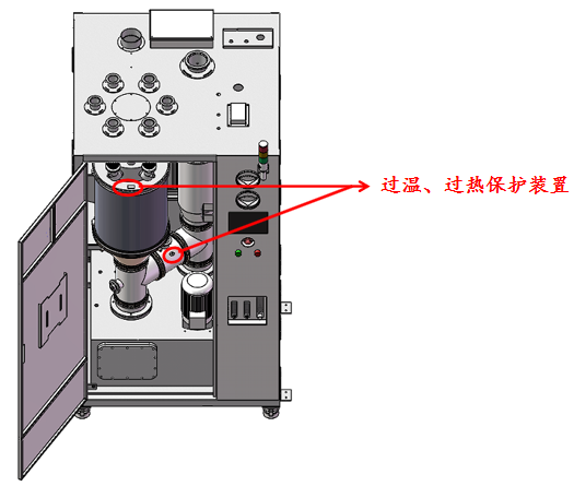 | 5 | 过温、过热安全 保护装置 | 主腔体外壁、涡旋腔体外壁、冷却腔体外壁 | 断开加热器控制开关 | 红灯 | 报警 | 是 | 人工复位 | 硬件 | 安全继电器 |