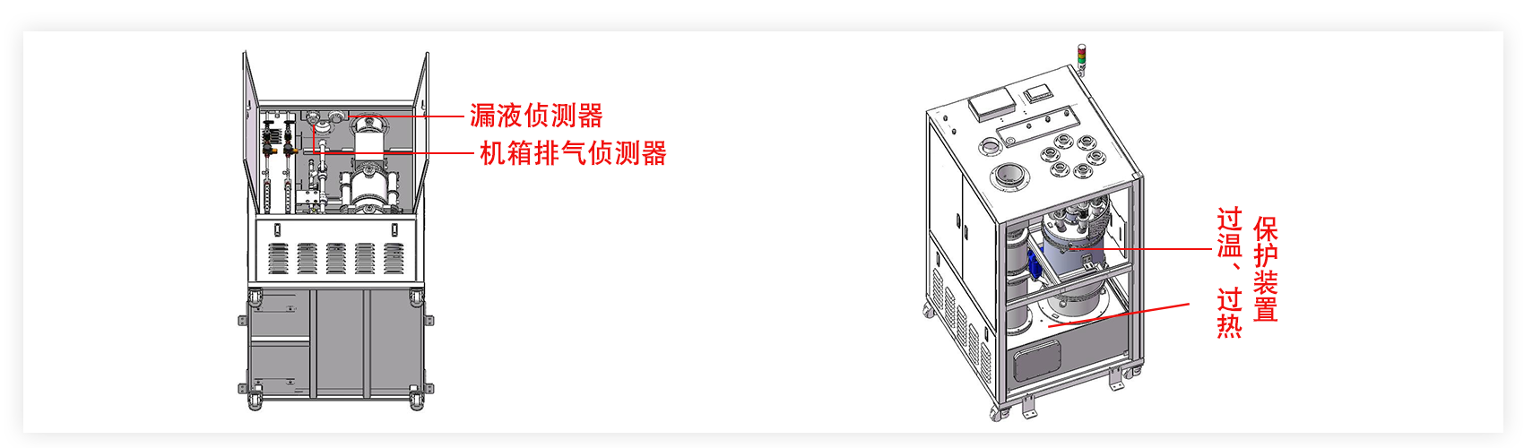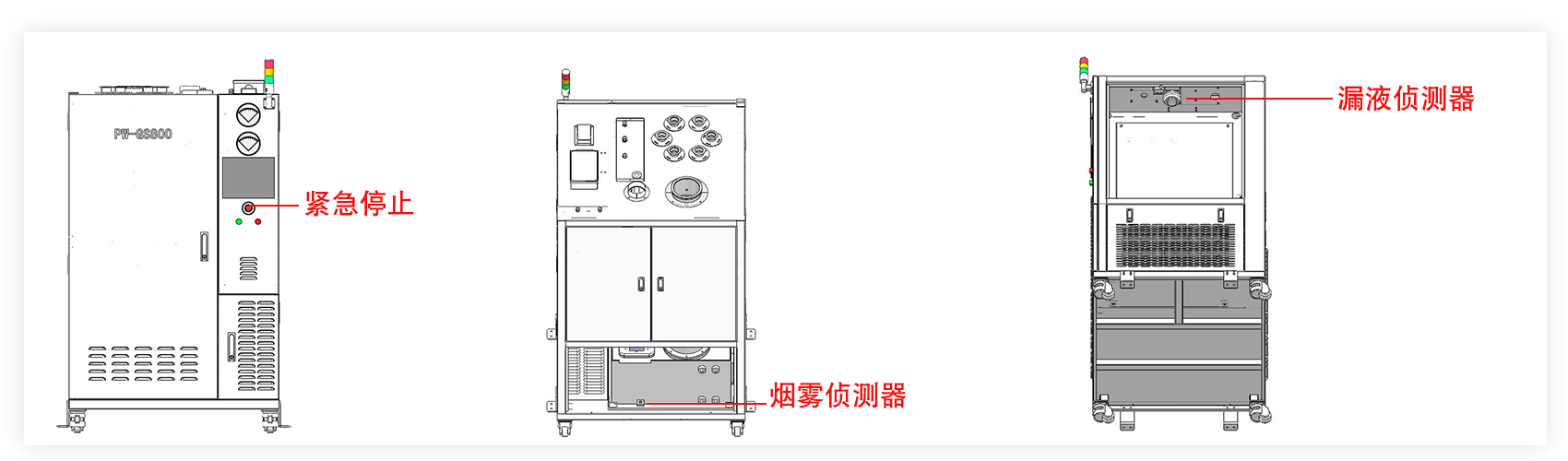 | 4 | 漏液侦测器 | 设备水箱前端、顶端 | 断开自来水、冷却 水、循环水和排水 | 红灯 | 报警 | 是 | 人工复位 | 硬件 | 安全继电器 |